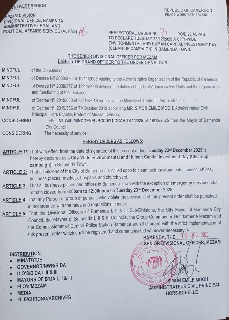 The order called upon all Bamenda residents to clean their environments, including homes, offices, markets, hospitals, and church yards. In light of this declaration, all business establishments, excluding emergency services, were to be closed from 6:00 AM to 12:00 noon yesterday Tuesday 23rd December 2025.