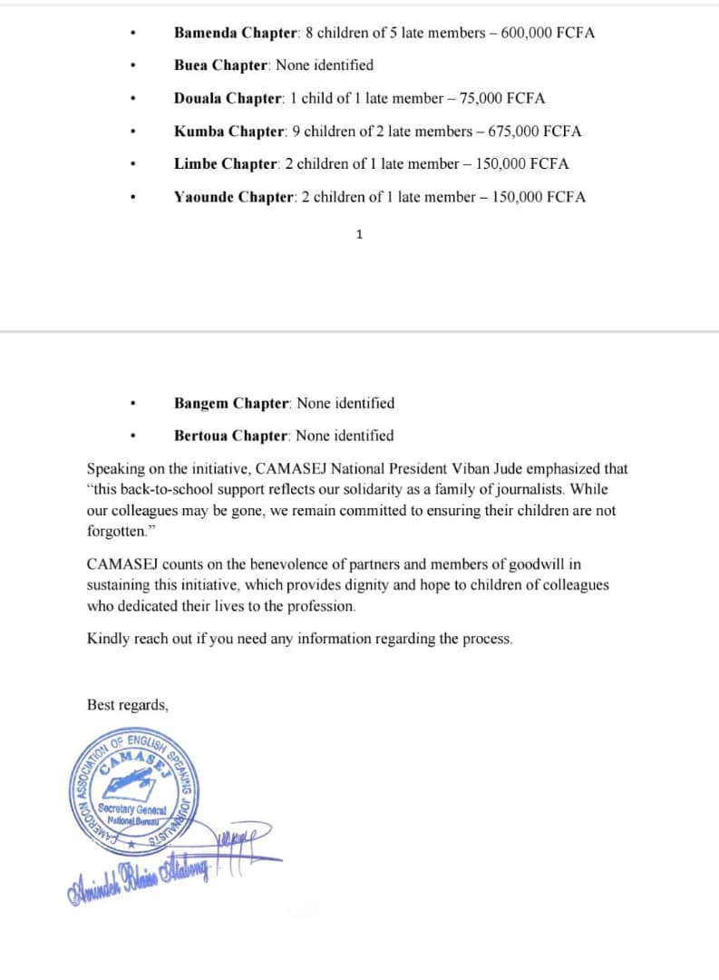The Cameroon Association of English-Speaking Journalists (CAMASEJ) has taken a significant step to support the children of its deceased members by providing back-to-school financial assistance totaling nearly 2 million FCFA. A total of 22 children from 10 deceased members across five chapters nationwide will benefit from this initiative.